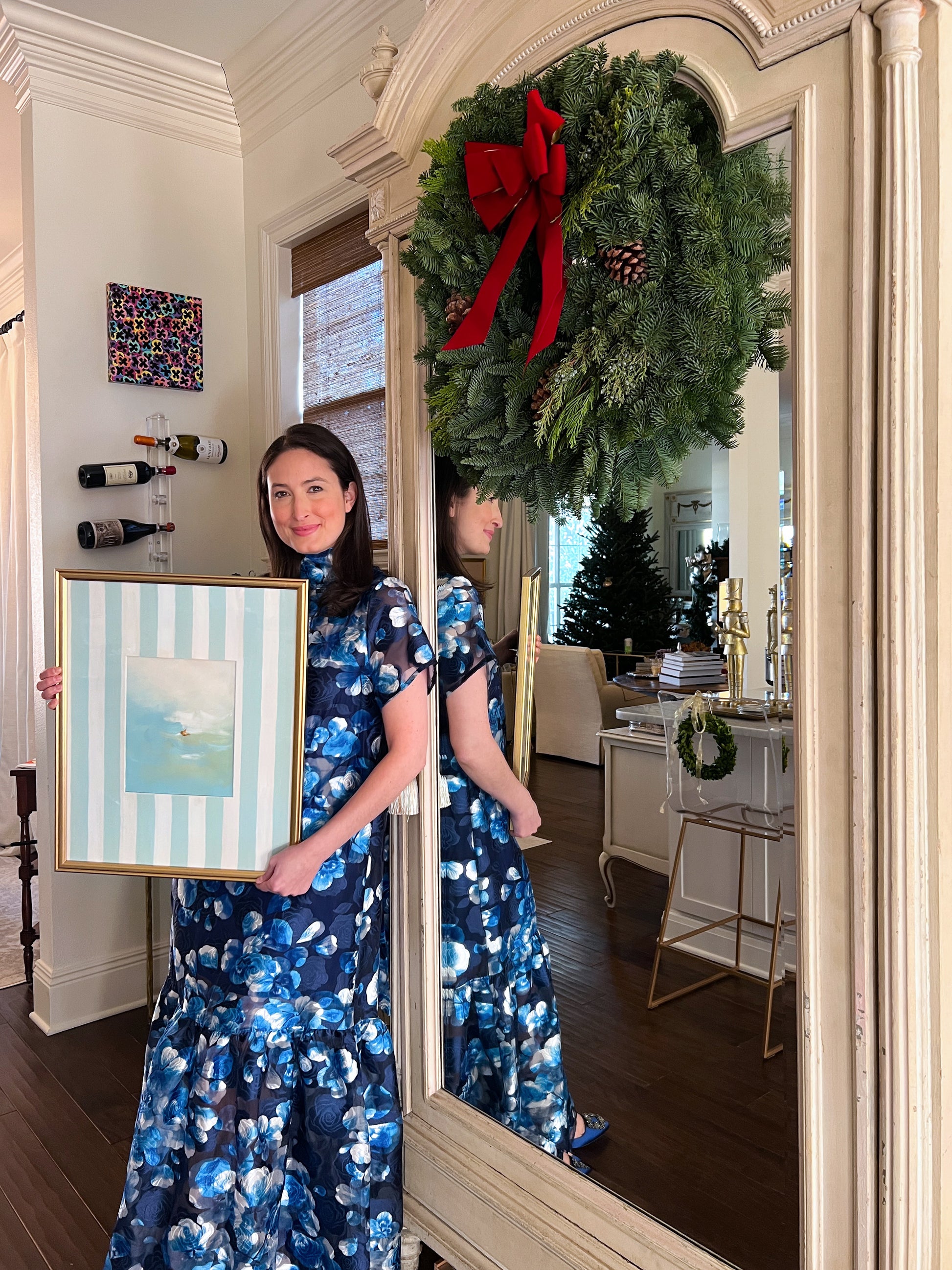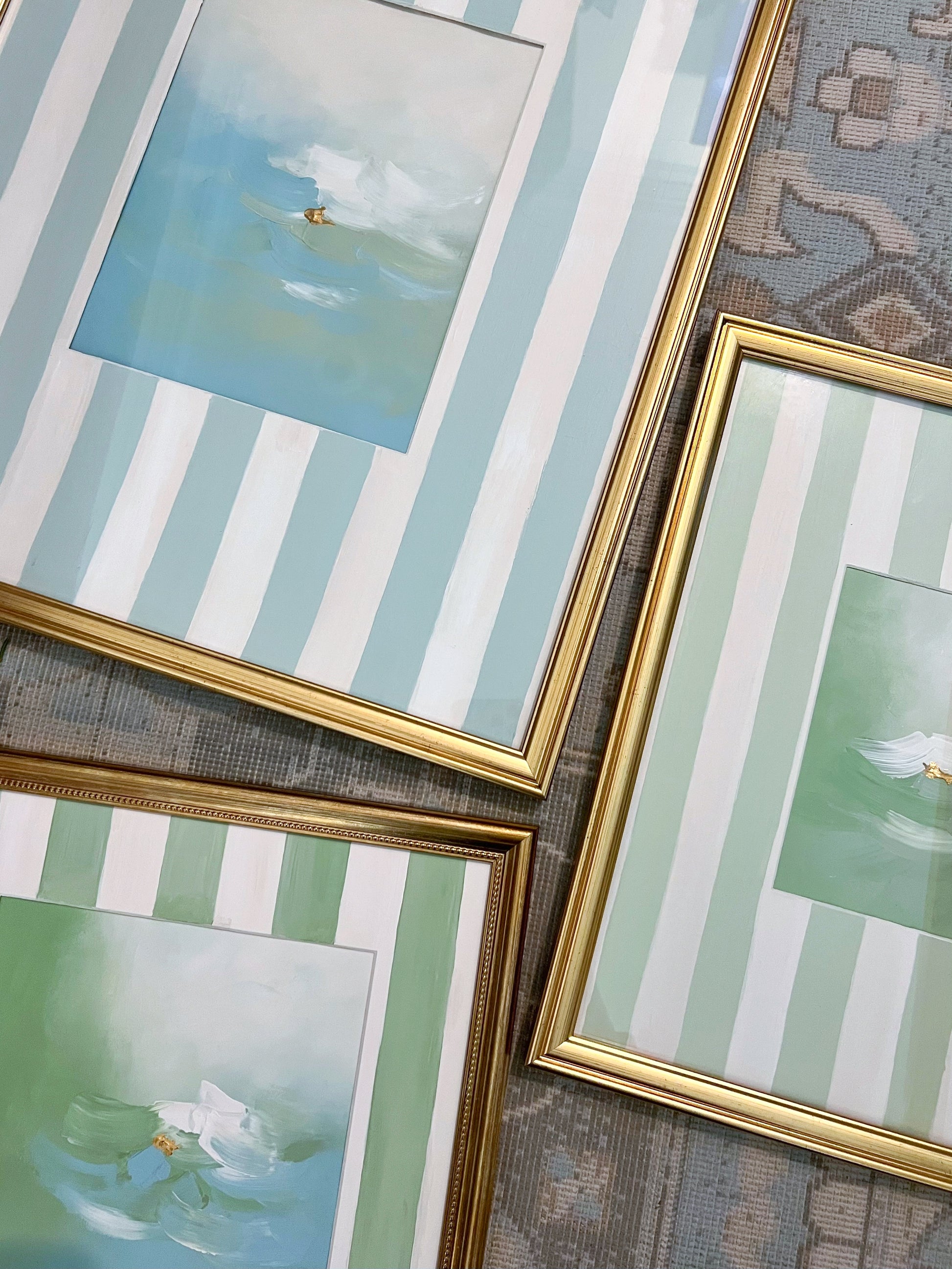 Original painting on paper, beautifully matted in a hand-painted mat and finished in a gold frame with glass front.